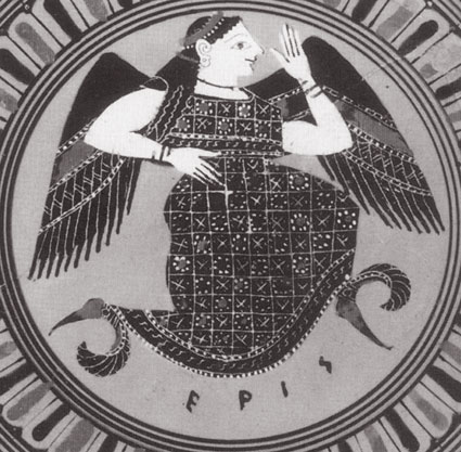 Zobrazení bohyně Eris na hrnci z berlínského muzea